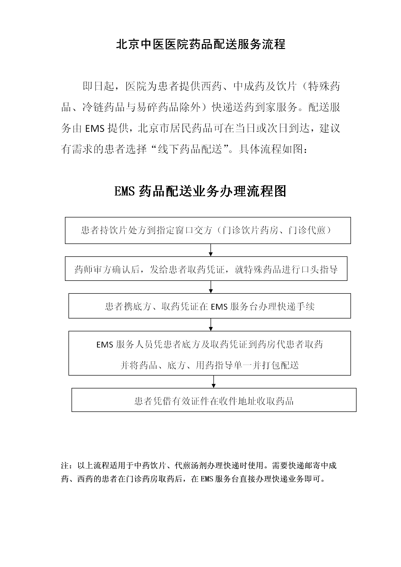 我院与中国邮政速递物流公司(EMS)合作,开通中草药、代煎汤药、病历的特快专递服务,这一举措极大地满足了患者的需求,尤其方便了上班族、老弱及外地患者足不出户,轻松取药,一经推出,受到患者普遍欢迎。