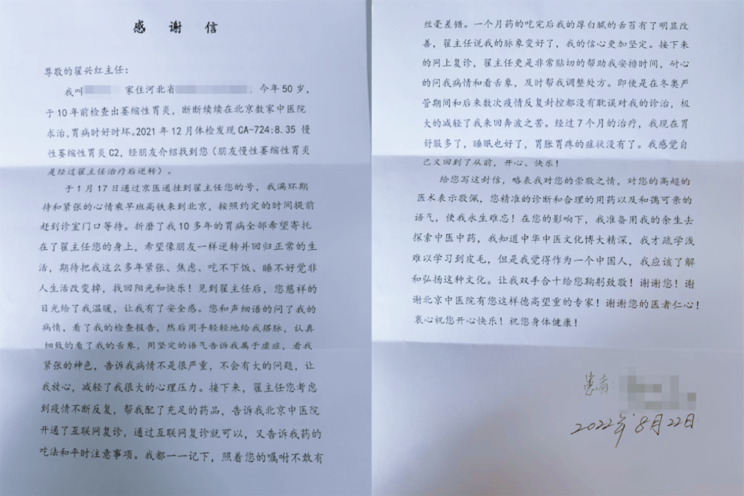 患者孙女士(化名)在我院互联网医院挂号时预约到翟兴红医生的号源,从此开启了线上医患交流模式,“虽然我们素不相识,但您对一名普通的患者如此热心。”孙女士在翟医生的治疗与开导下,胃病明显缓解,特地手写了一封感谢信送到了医院。两位患者用心写下的“感谢信”,即是对翟医生最大的认可和肯定。