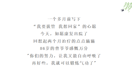 康复治疗4周后,曾爷爷的正常呼吸模式得以建立,可主动咳嗽排痰,语音较前洪亮,能够进行短句为主的言语交流。近日,曾爷爷“脱机拔管、出院回家”的心愿终于实现。回家后,他仍然需要准备制氧机经常吸氧,相信经过一段时间的调养,曾爷爷又可以练起气功来了。