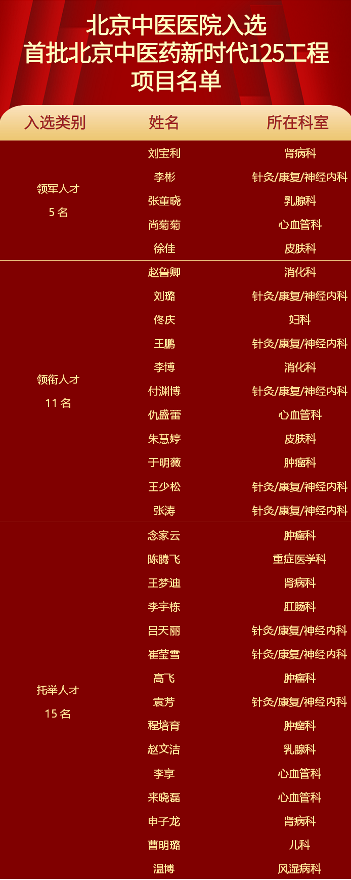 近日,根据《北京中医药新时代125工程(新125人才)实施方案》、《北京中医药新时代125工程(新125人才)遴选方案》,北京市中医药管理局公布了北京中医药新时代125工程(下文简称“新125人才”)培养对象名单。首都医科大学附属北京中医医院共31名人才入选,包含领军人才5名,领衔人才11名,托举人才15名。