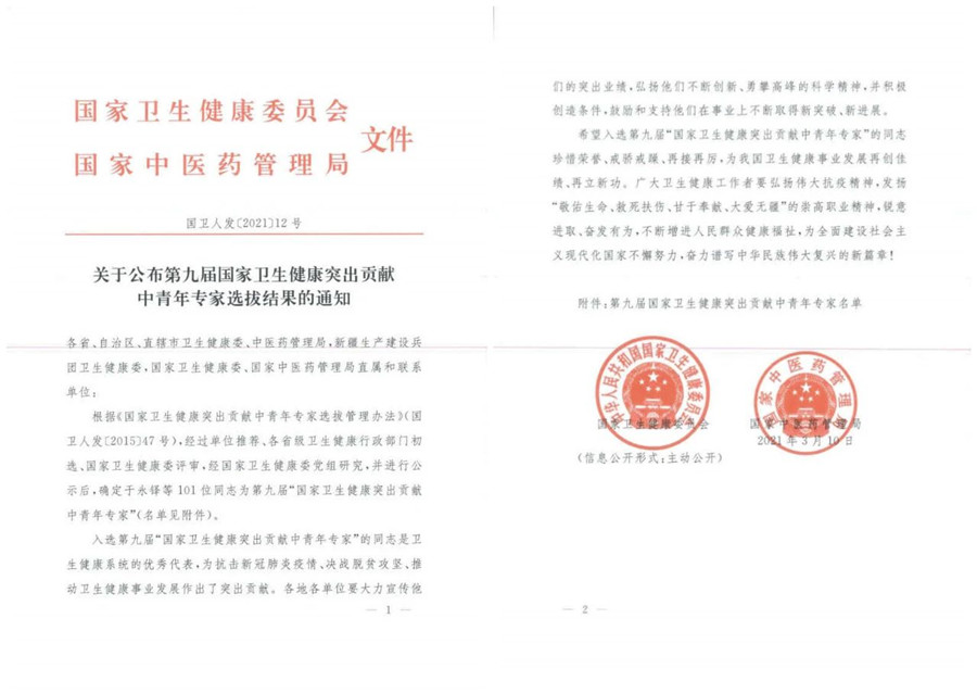 入选本届“国家卫生健康突出贡献中青年专家”的同志是卫生健康系统的优秀代表,他们为抗击新冠肺炎疫情、决战脱贫攻坚、推动卫生健康事业发展作出了突出贡献。