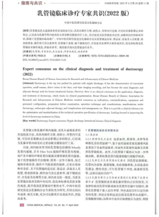 日前,作为中国中医药研究促进会乳腺病分会主任委员单位,我院乳腺科与本领域专家共同书写并发表了国内首版乳管镜专家共识《乳管镜临床诊疗专家共识(2022版)》,对乳头溢液类疾病的早诊断、准确定位和治疗具有重要意义,在早期诊疗乳腺癌中发挥重要作用。