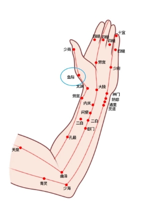鱼际穴如何取穴?在第一掌指关节的根部,也就是大拇指的下方,有一块隆起的肌肉,我们叫它大鱼际,在大鱼际的边缘(赤白交界处),按压有酸胀的地方就是鱼际穴。