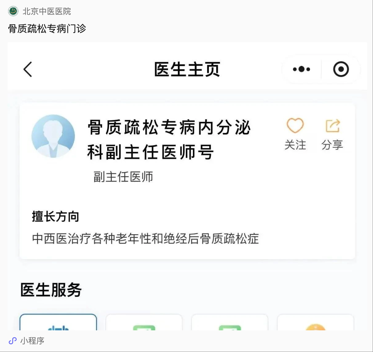 首都医科大学附属北京中医医院内分泌科已开展骨质疏松专病门诊,是针对骨质疏松症设立的专科诊疗服务,为患者提供精准诊断、中西医结合系统治疗骨质疏松症以及预防脆性骨折的防治指导服务。