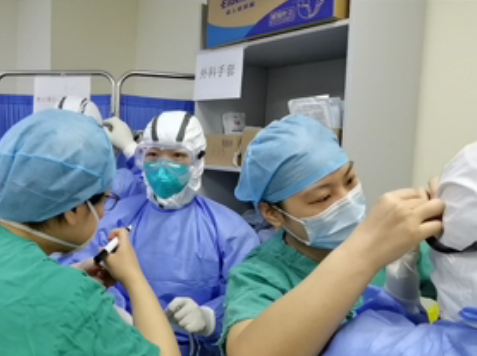 1月31日,正月初七,我院驰援武汉医疗队的护理人员:关丽、马娜、张芳芳进入病区工作。在准备区,队员们相互帮忙,穿戴好防护服。经过严格检查后,进入病房开始护理工作。