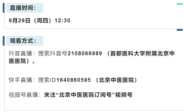 9月29日12:30,肛肠科李宇栋副主任医师、周仲伍主治医师做客北京中医医院科普直播间,带您一起找回秋日健康。