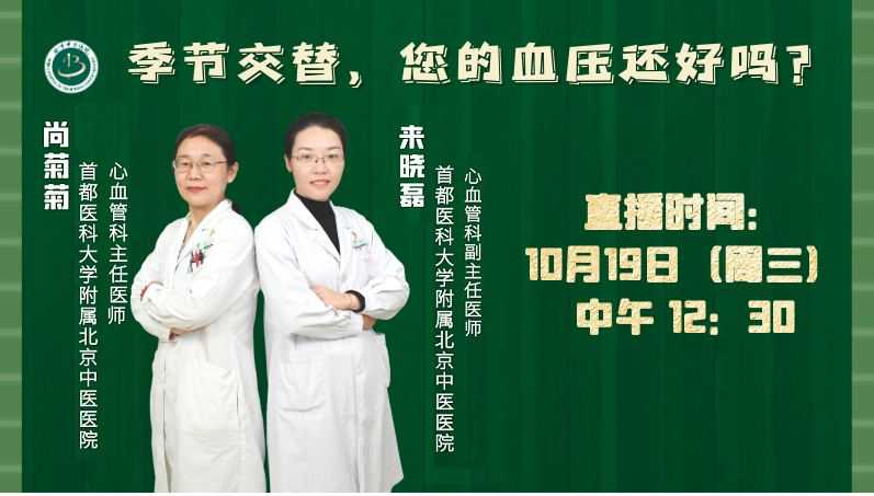 10月19日12:30,心血管科尚菊菊主任医师、来晓磊副主任医师做客北京中医医院科普直播间,为您解决换季血压困扰。传播实用、有趣科普知识,就在北京中医医院科普直播间!
