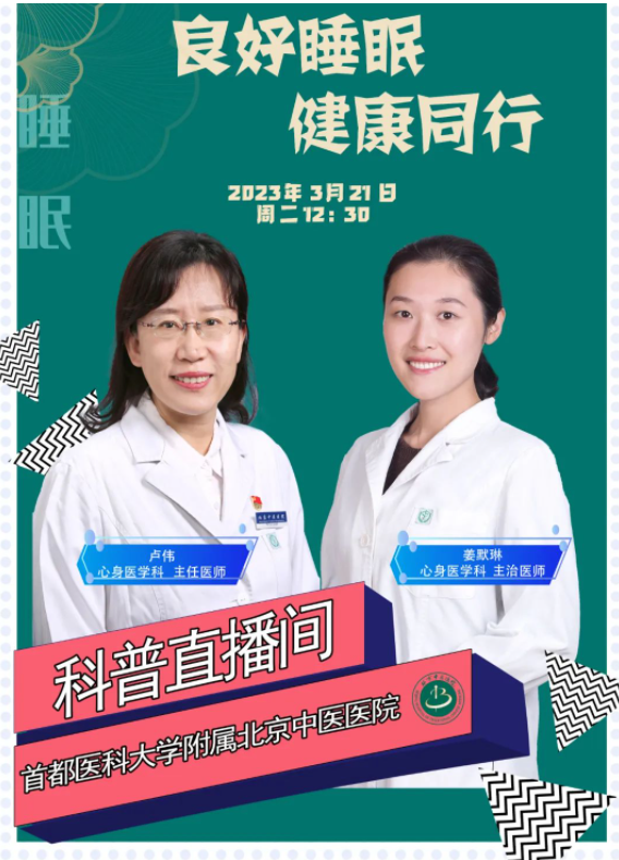 3月21日是世界睡眠日,今年的主题是“良好睡眠,健康同行”。北京中医医院心身医学科主任医师卢伟、主治医师姜默琳3月21日12:30做客北京中医医院科普直播间,为您讲解中医诊疗失眠的妙招绝招。