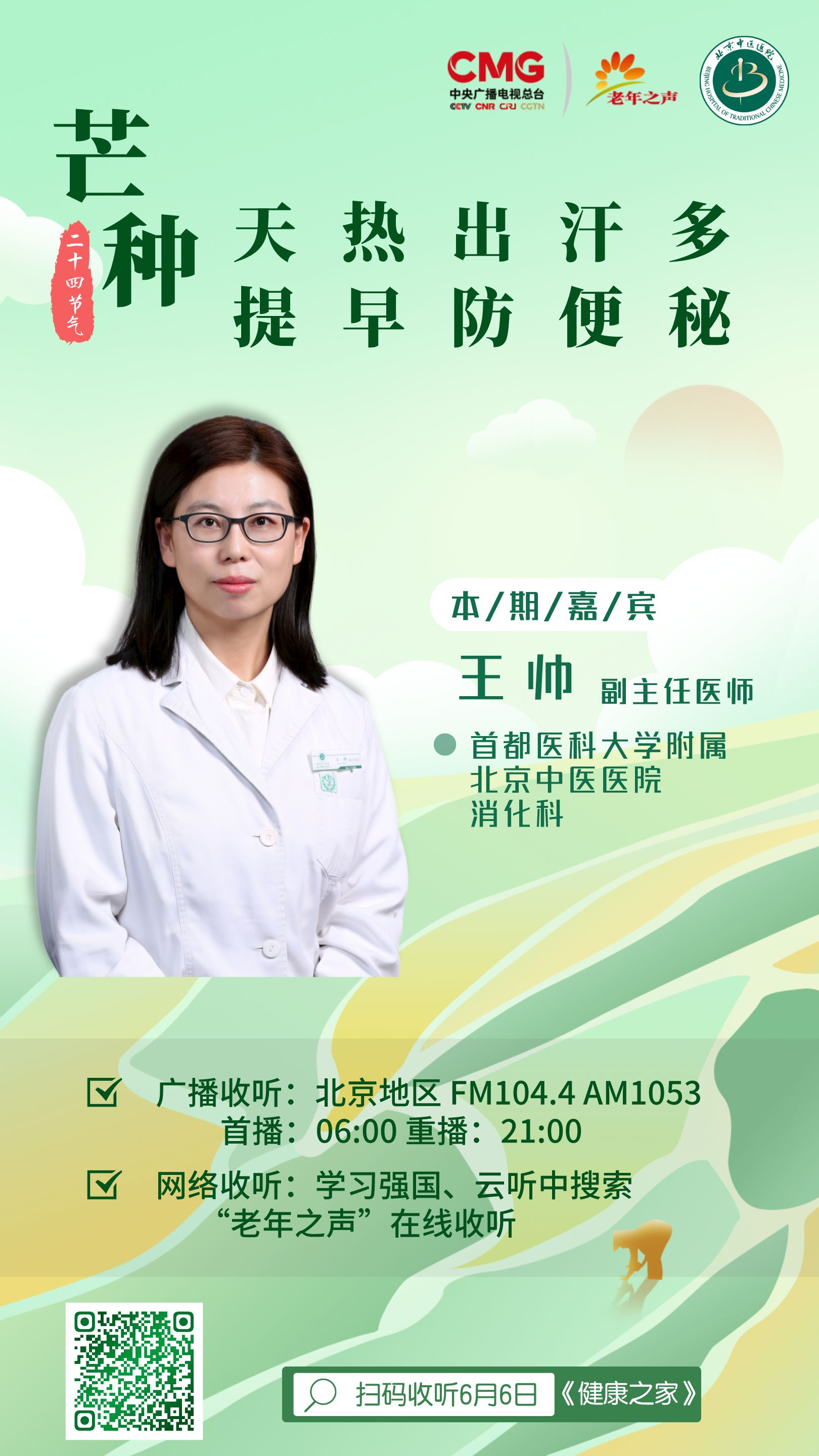 芒种是二十四节气中的第9个节气,芒种节气后,全国各地雨量逐渐充沛,气温显著升高,湿与热夹杂,是许多疾病的高发季。北京中医医院消化科副主任医师王帅提醒您,天热出汗多,提早防便秘。