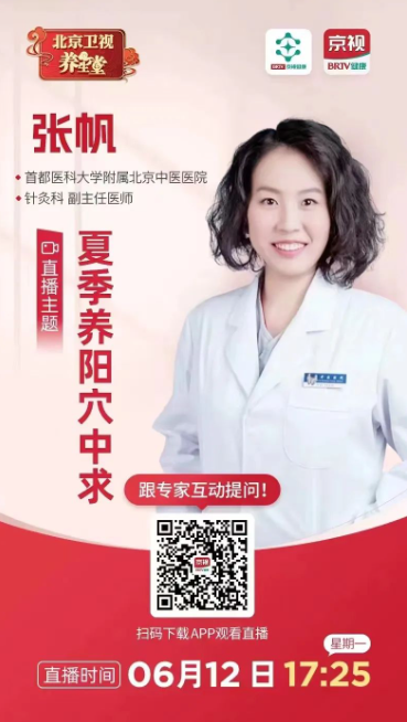 今天17:25,北京中医医院针灸/康复/神经内科孙敬青主任医师、张帆副主任医师做客北京卫视《养生堂》,为您讲解《夏季养阳“穴”中求》。