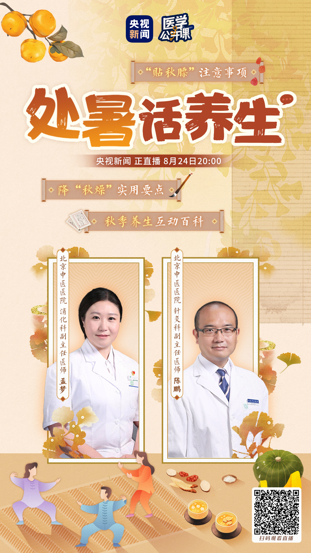 “立秋不是秋,秋在处暑后。”处暑到,处暑之后秋意渐浓,节令更替,各地气候陆续变化,这个时节我们要做哪些饮食、运动等方面的调整?入秋后我们又容易遇到哪些健康问题?8月24日20点,首都医科大学附属北京中医医院针灸/康复/神经内科副主任医师陈鹏、消化科副主任医师孟梦做客央视新闻“医学公开课”直播栏目,和您一起处暑话养生。