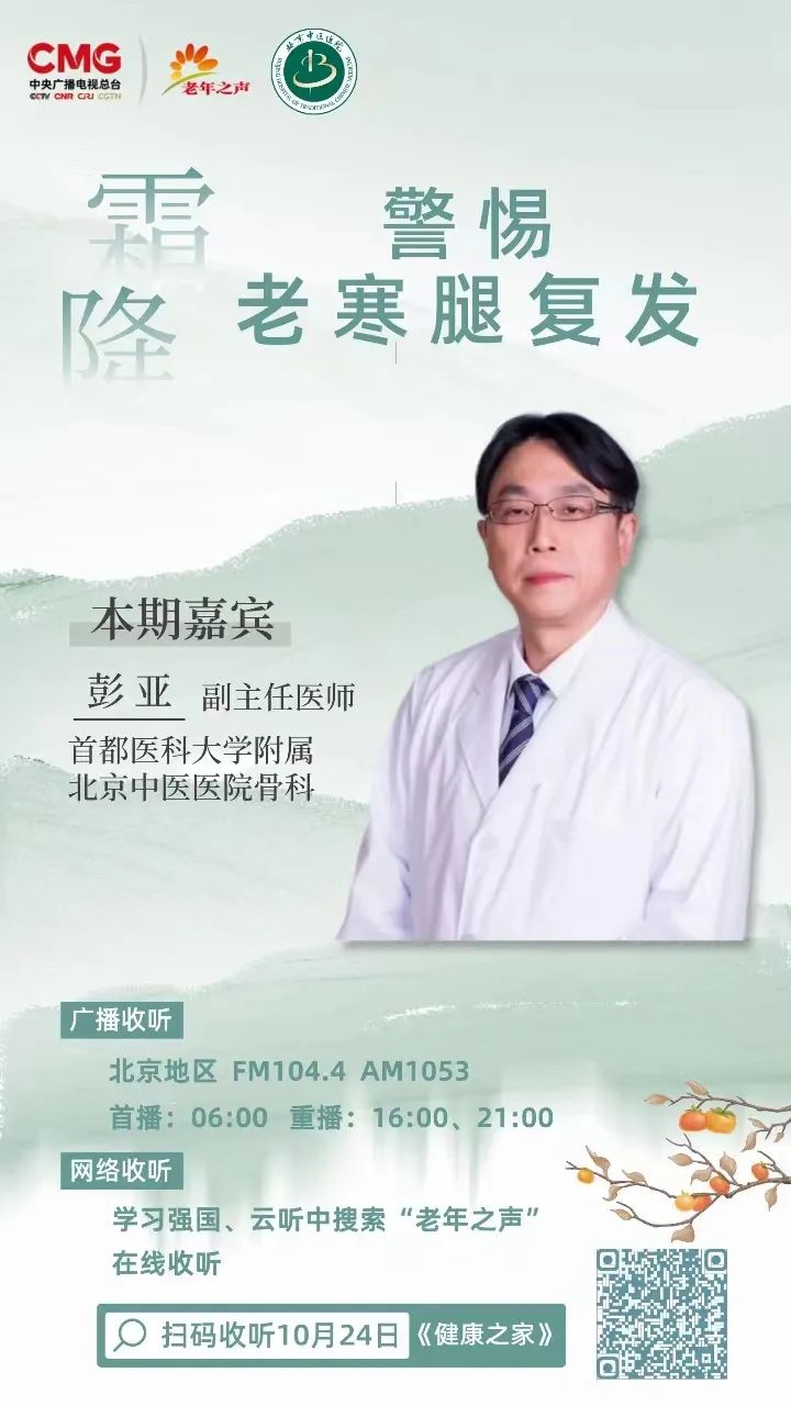 首都医科大学附属北京中医医院骨伤科副主任医师彭亚做客中央广播电视总台老年之声,为您详解《霜降节气,警惕老寒腿复发》。