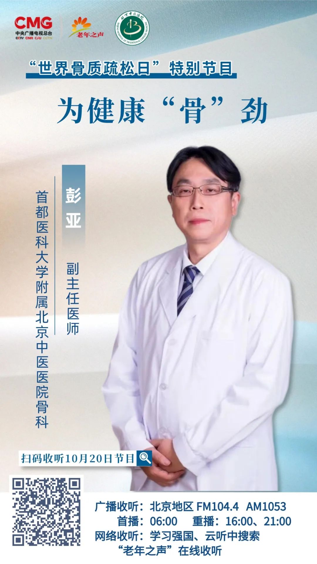 首都医科大学附属北京中医医院骨伤科副主任医师彭亚做客中央广播电视总台老年之声“世界骨质疏松日”特别节目,为您详解《为健康“骨”劲》。