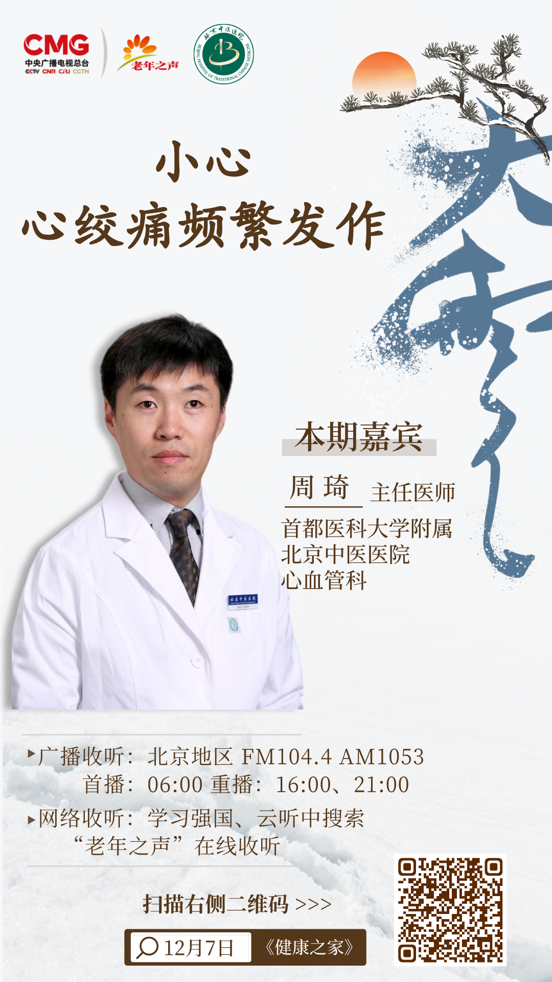 如何平稳过冬季?首都医科大学附属北京中医医院心血管科主任医师周琦做客中央广播电视总台老年之声,为您详解《大雪节气,小心心绞痛频繁发作》。