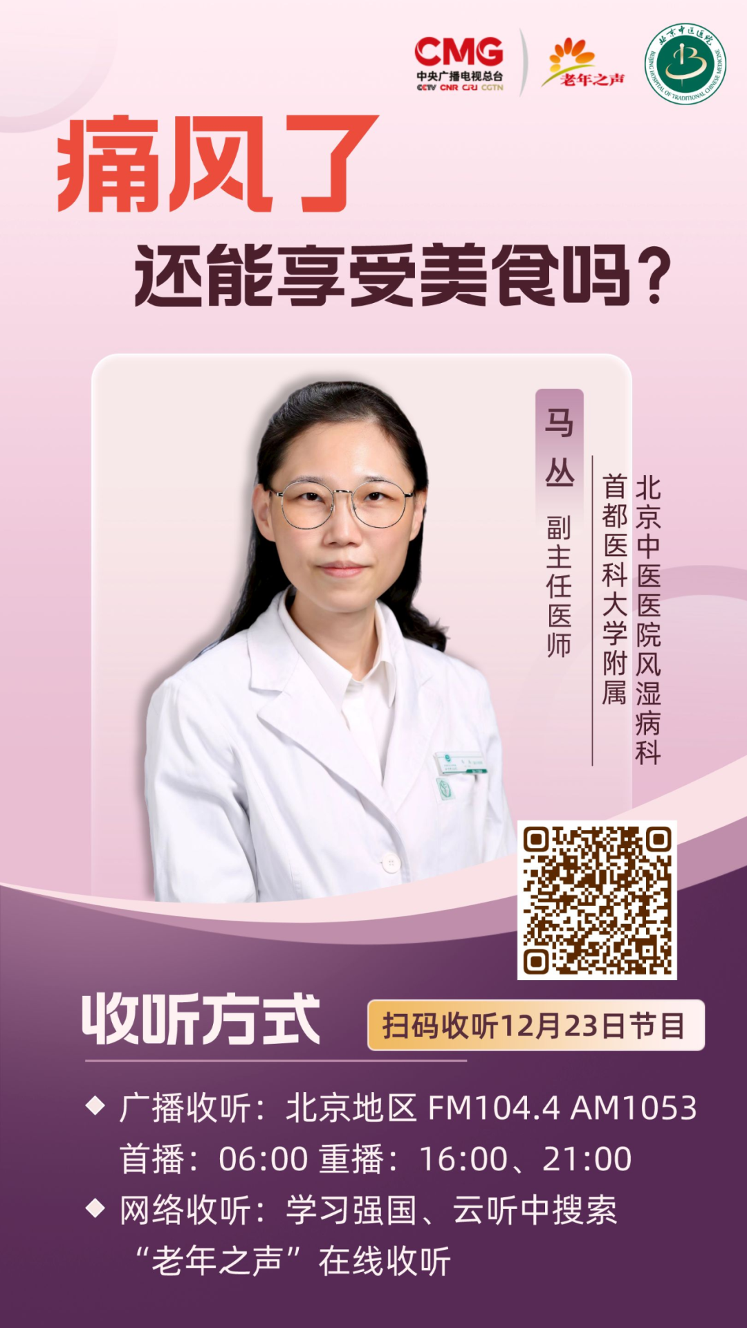 首都医科大学附属北京中医医院风湿病科副主任医师马丛做客中央广播电视总台老年之声,为您详解《痛风了,还能享受美食吗?》。