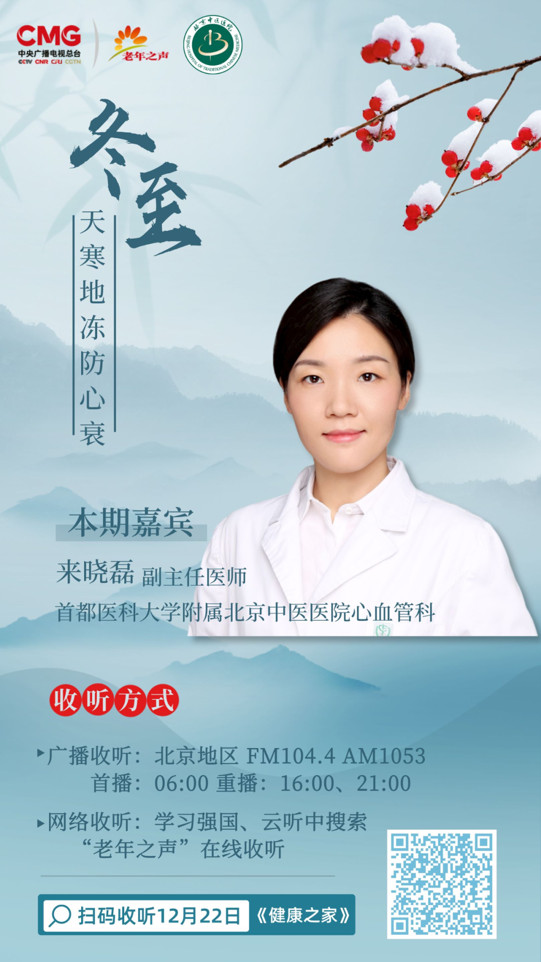 12月22日是冬至节气,首都医科大学附属北京中医医院心血管科副主任医师来晓磊做客中央广播电视总台老年之声,为您详解《天寒地冻防心衰》。