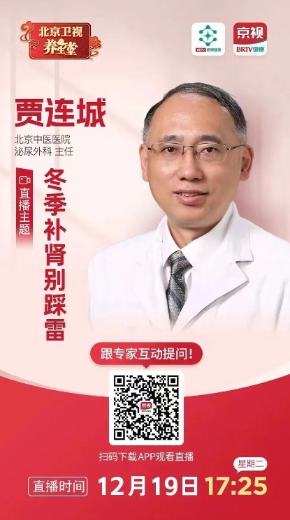 今天17:25,北京中医医院泌尿外科主任医师贾连城做客北京卫视《养生堂》,为您讲解《寒冬补肾有秘诀》。