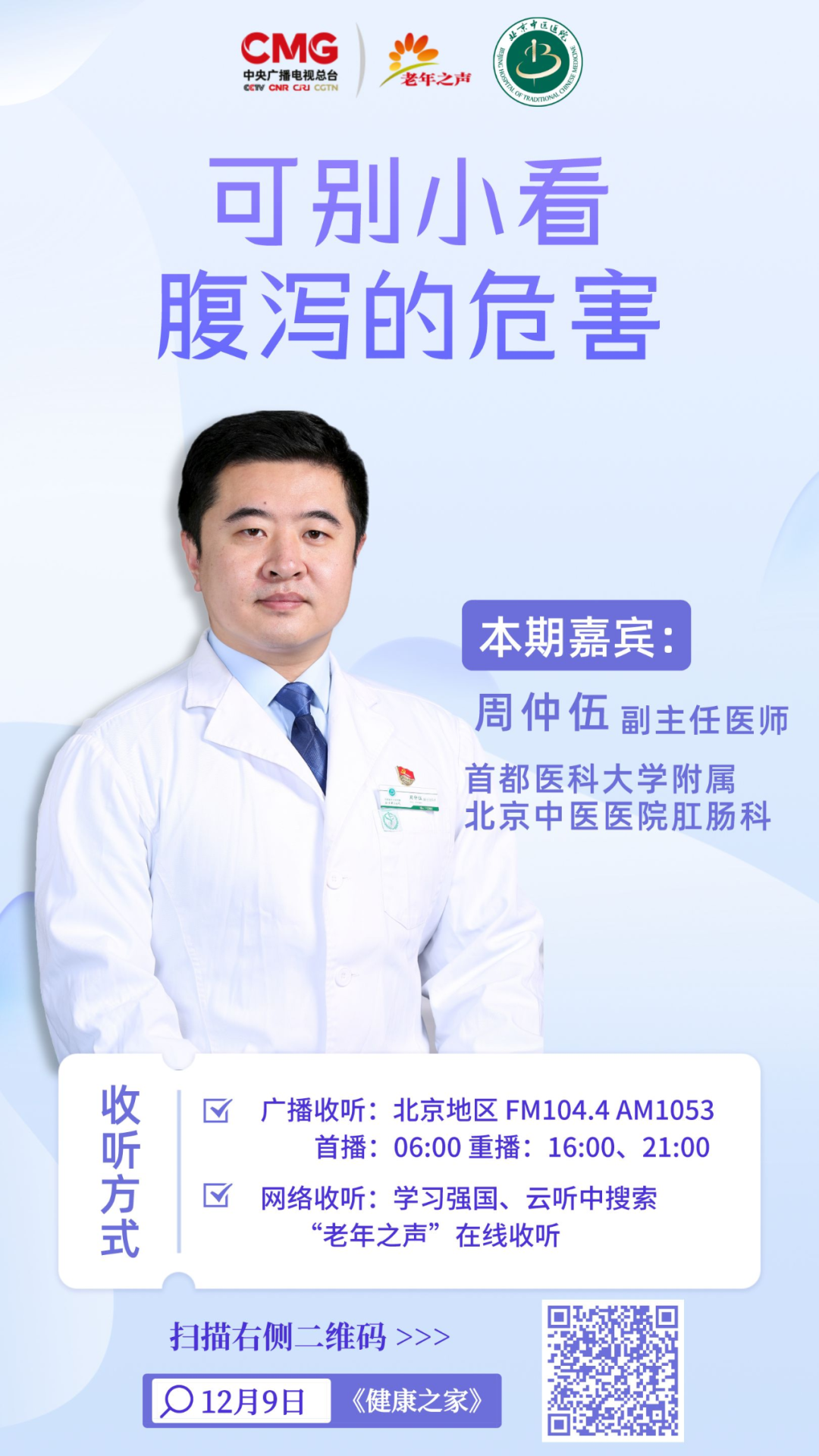 首都医科大学附属北京中医医院肛肠科副主任医师周仲伍做客中央广播电视总台老年之声,为您详解《可别小看腹泻的危害》。