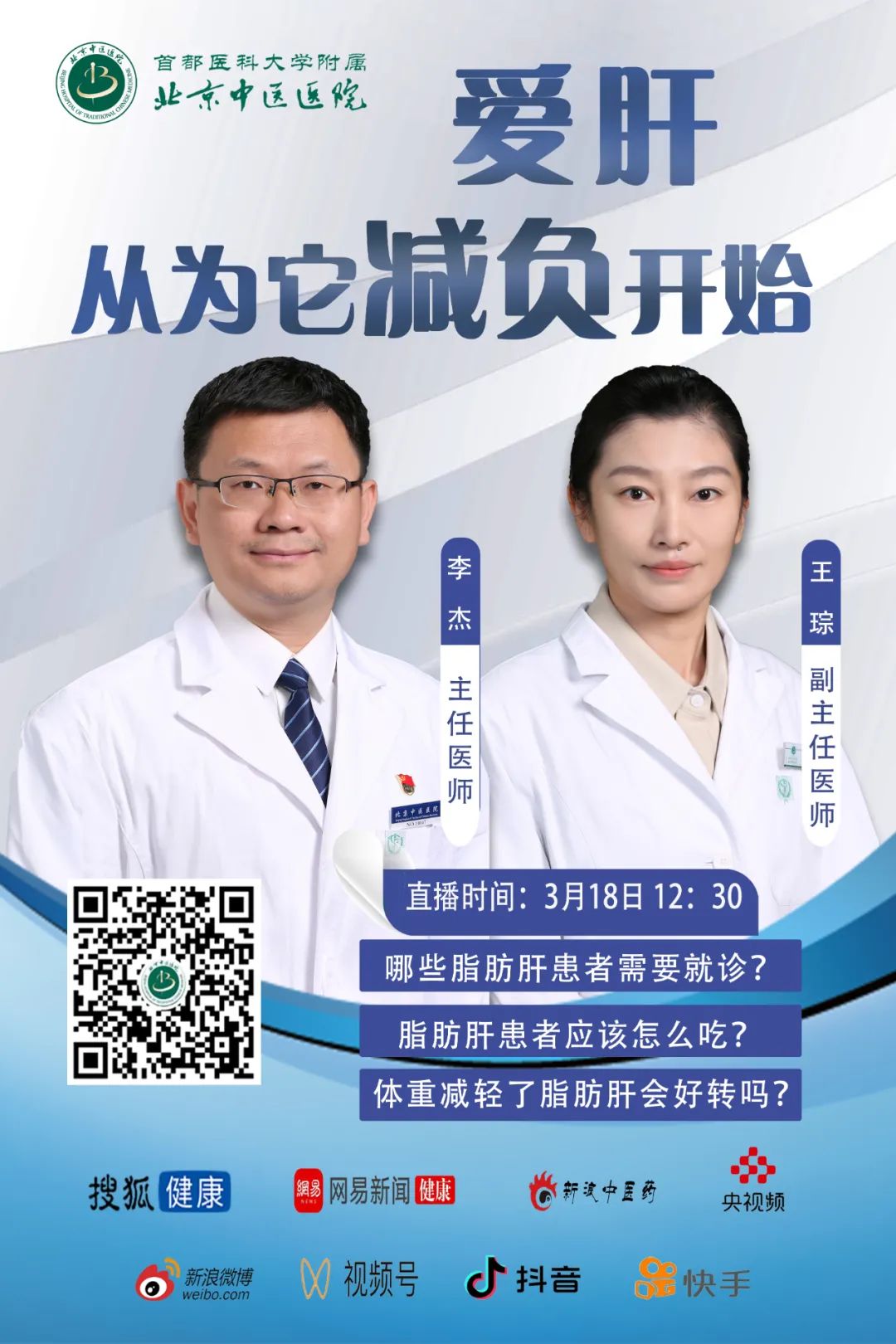 3月18日是全国爱肝日,当天12:30,北京中医医院肝病科李杰主任医师、王琮副主任医师将做客科普直播间,为您详解脂肪肝那些事儿。