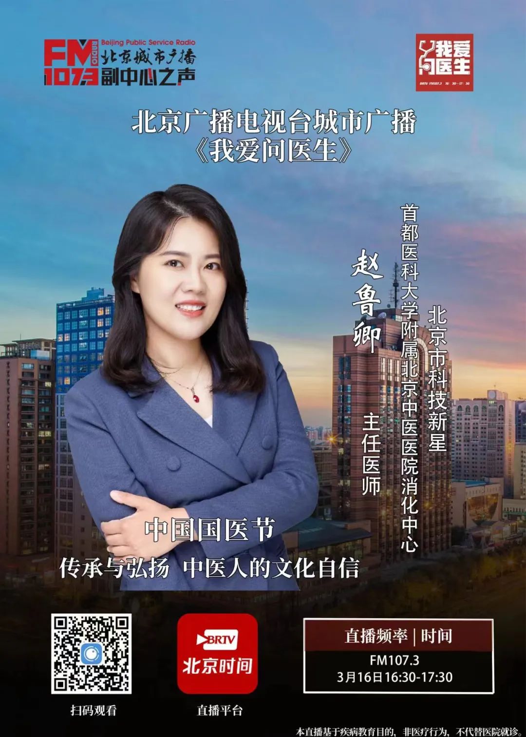北京中医医院消化科主任医师赵鲁卿做客北京广播电视台城市广播《我爱问医生》,畅谈“传承与弘扬,中医人的文化自信”。