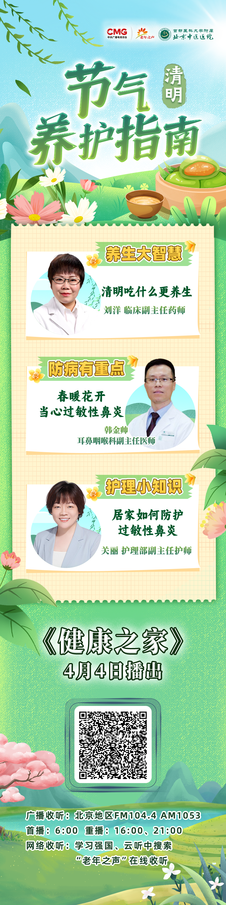 首都医科大学附属北京中医医院副主任药师刘洋、副主任医师韩金帅、副主任护师关丽做客中央广播电视总台老年之声,为您详解清明节气养护指南。
