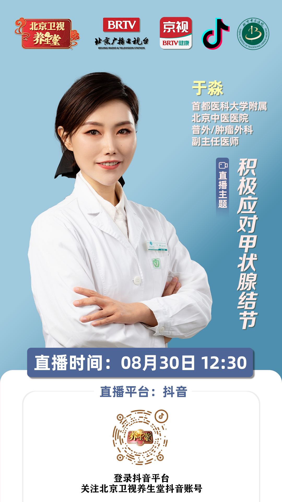 8月30日12:30,北京中医医院普外/肿瘤外科副主任医师于淼做客北京卫视养生堂科普直播间,详解《积极应对甲状腺结节》。