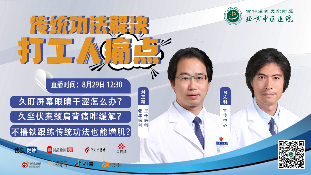 8月29日12:30,北京中医医院老年病科主任医师刘玉超做客北京中医医院科普直播间,详解“传统功法解决打工人痛点”。