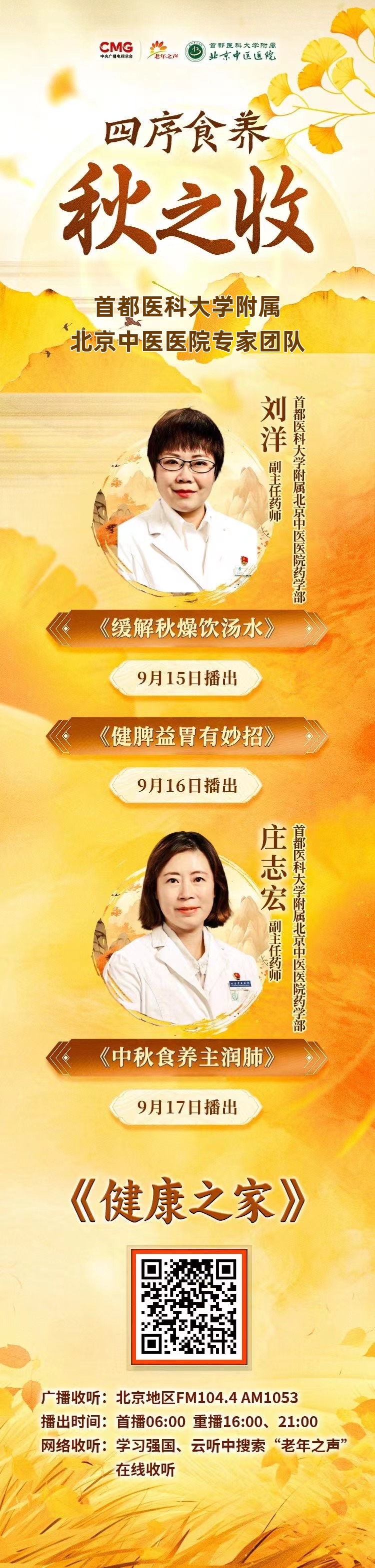 首都医科大学附属北京中医医院范峥副主任药师、李博主任医师、白京华护士长做客中央广播电视总台老年之声,为您详解秋分节气养护指南。