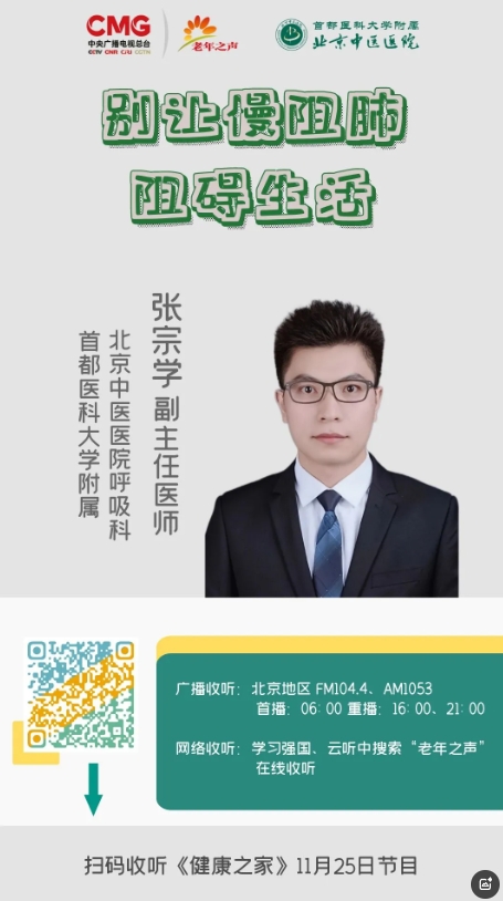 首都医科大学附属北京中医医院呼吸科副主任医师张宗学做客做客中央广播电视总台老年之声,为您讲解“别让慢阻肺阻碍生活”。
