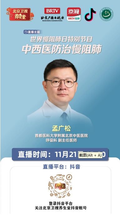 11月21日15:00,北京中医医院呼吸科副主任医师孟广松做客北京卫视养生堂科普直播间,为您讲解“中西医防治慢阻肺”。