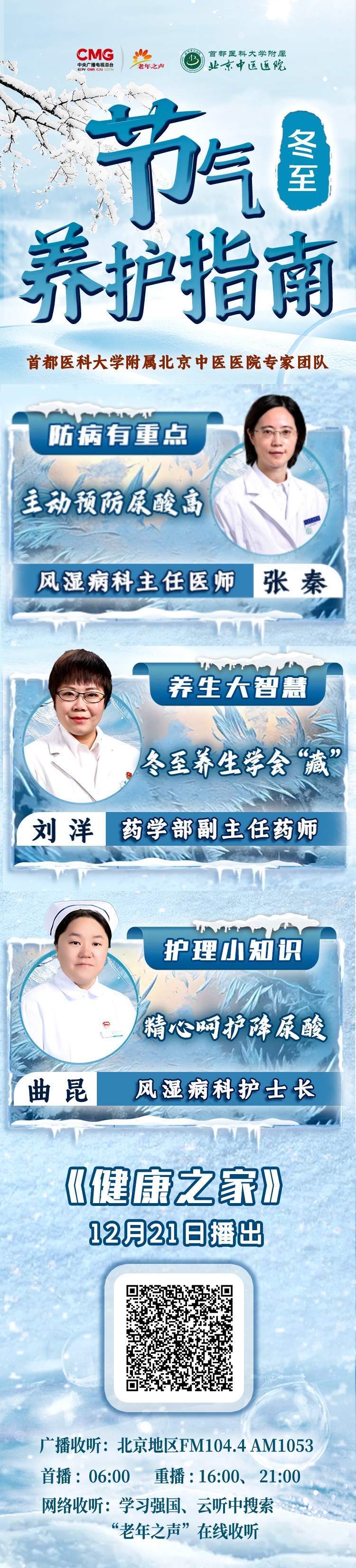 首都医科大学附属北京中医医院风湿病科主任医师张秦、药学部副主任药师刘洋、风湿病科护士长曲昆做客中央广播电视总台老年之声,为您详解冬至节气养护指南。