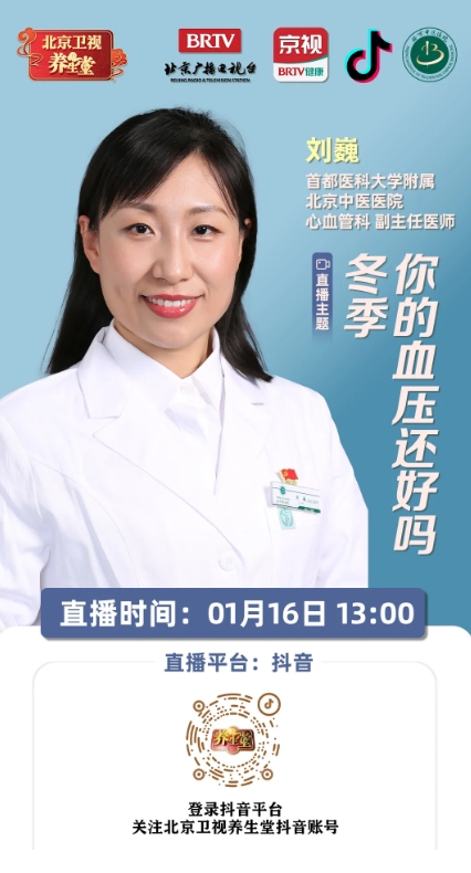 1月16日13:00,首都医科大学附属北京中医医院心血管科副主任医师刘巍做客北京卫视养生堂科普直播间,为您讲解“冬季 你的血压还好吗”。
