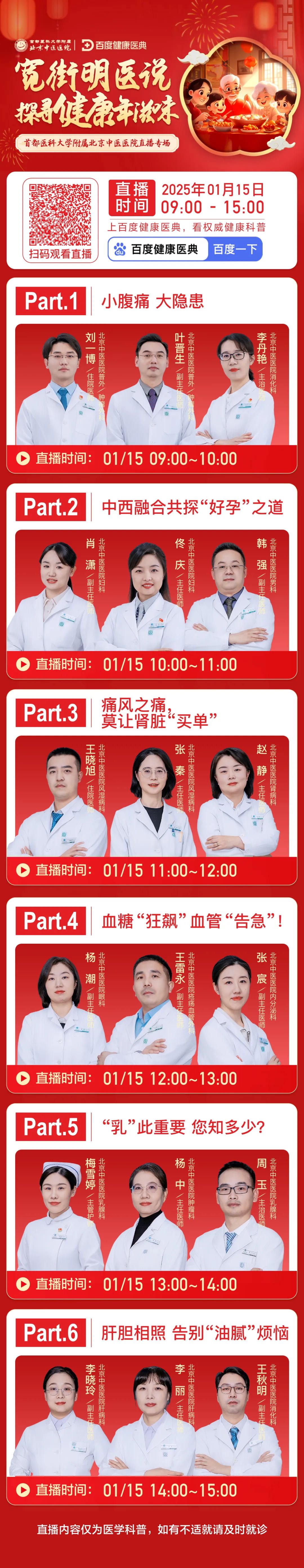 首都医科大学附属北京中医医院联合百度健康医典策划"宽街明医说 探寻健康年滋味" 系列直播,来自12个科室的18位专家与您共同探寻健康年滋味,助您安心过春节。