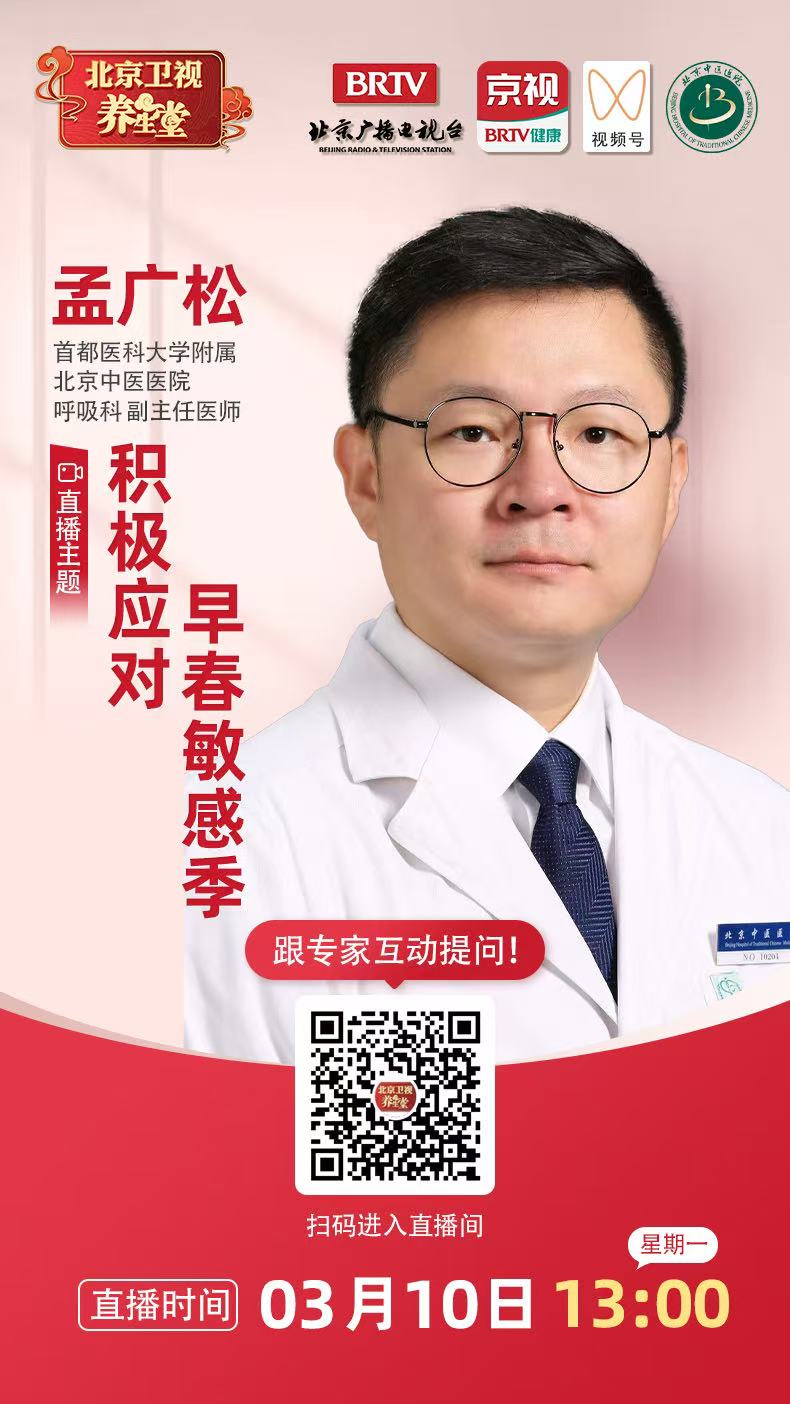 3月10日13:00,首都医科大学附属北京中医医院呼吸科副主任医师孟广松做客北京卫视养生堂直播间,讲解“积极应对早春敏感季”。