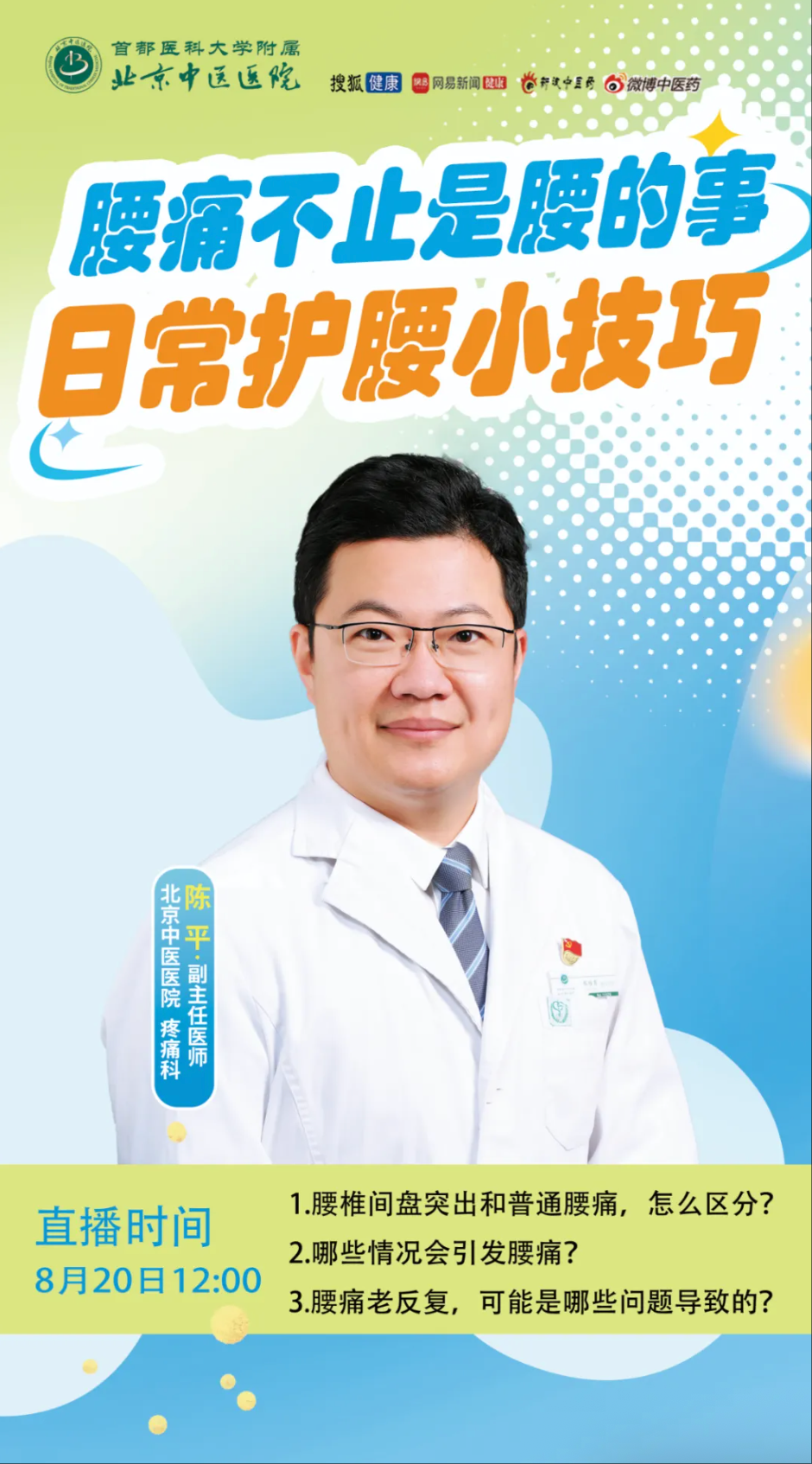 8月20日12:00,首都医科大学附属北京中医医院疼痛科副主任医师陈平做客北京中医医院科普直播间,讲解日常护腰小技巧。