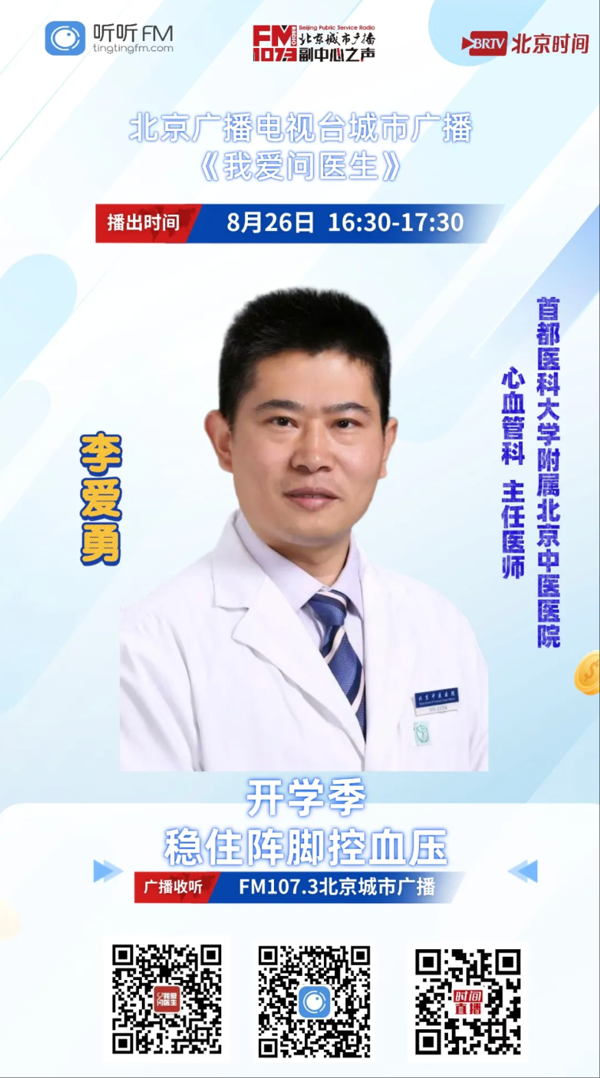 8月26日16:30,首都医科大学附属北京中医医院心血管科主任医师李爱勇做客北京城市广播“我爱问医生”栏目,讲解“开学季 稳住阵脚控血压”。