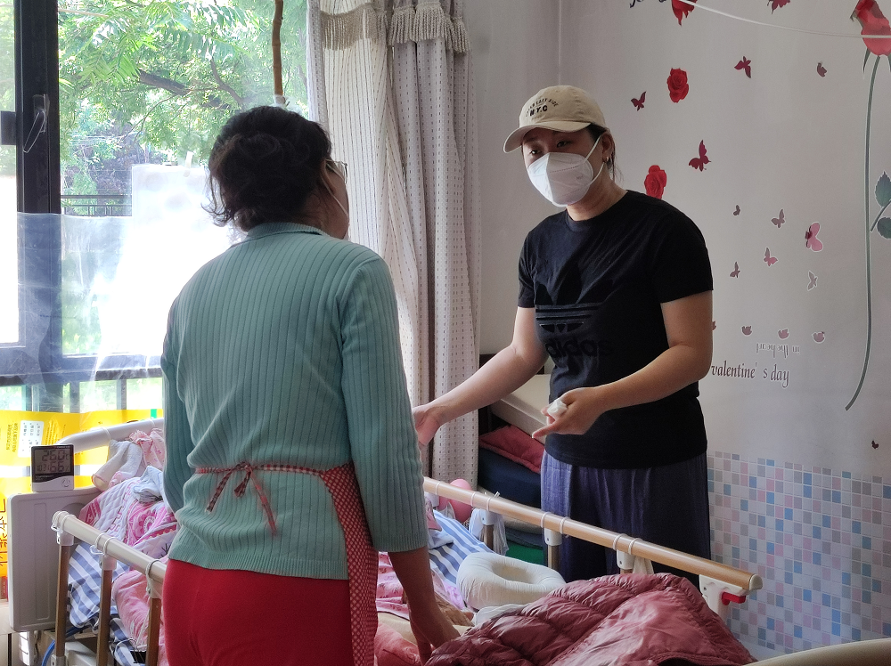 5月21日,志愿者微信群突然发来求助信息:85岁卧床老人,导尿管已过期10天,家中自备材料,急需有医护人员帮助更换尿管。温妍看到信息后,立刻在群内报名,拿上证件马上出发。在居委会工作人员的带领下,温妍来到了老人家。评估完老人的基本情况后,温妍很顺利地帮助她更换了尿管。看到老人还插着胃管,又细心地向家属讲解了鼻饲时的注意事项,以及卧床老年人预防压疮的方法。