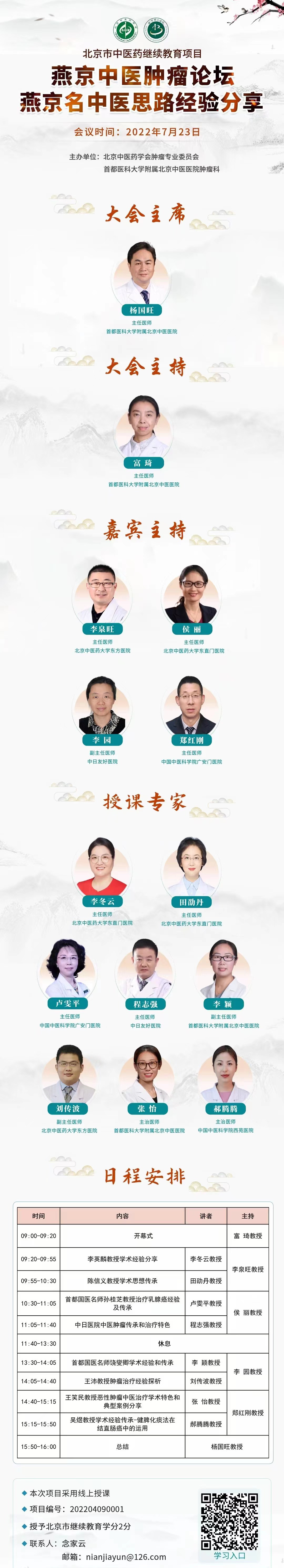 7月23日9:00,由北京中医药学会肿瘤专委会和北京中医医院肿瘤科联合举办的第三届燕京中医肿瘤论坛将于线上召开。本次论坛在分享初代大家学术思想基础上,重点介绍后辈中坚的学术经验和传承创新,促进中医肿瘤事业发展。