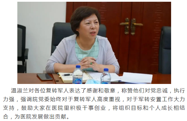 “我们要保持军人作风,踏实工作。”“军人的特点是服从能力强,听从指挥。”“作为一名转业干部,要做到退伍不褪色,转业不转志,敢打善战。”“军转安置要将科室需求和专业匹配起来。”“虽然像我这样的非临床专业的军转干部专业技术水平还不够精进,但是我们执行力强,工作不畏难、不怕险,尽力把每件工作完成到最好。”“希望医院能给军转干部提供适合发展的平台,进一步加强业务培训。”“今天对我们来说是个特殊的日子,医院特地召开座谈会表达对我们的关怀,让我们感受到了组织的温暖,今后在工作中我们一定要继续发挥所学所长,为医院发展做贡献。”听着大家的发言,院领导们一边记录着,一边不时对问题进行及时回应。