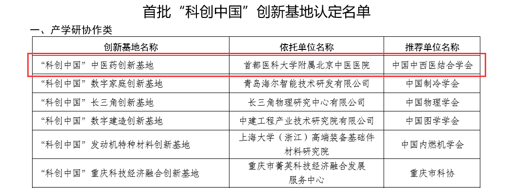 近日,中国科协发布认定首批“科创中国”创新基地的通知,首都医科大学附属北京中医医院“科创中国”中医药创新基地成功入选。