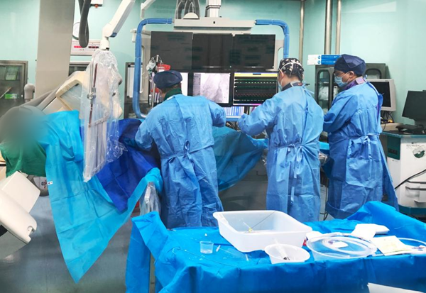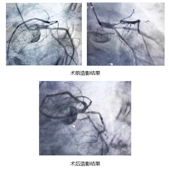 接诊医师发现这位没有家属陪同的患者是我院内分泌科护士张芳芳的爱人,而她此刻正在拉萨执行援藏任务。此时急诊造影结果显示前降支开口部位95%~99%狭窄,呈次全闭塞状态,病势十分凶险,有随时猝死的可能。我院迅速开通绿色通道,将患者送入介入室。