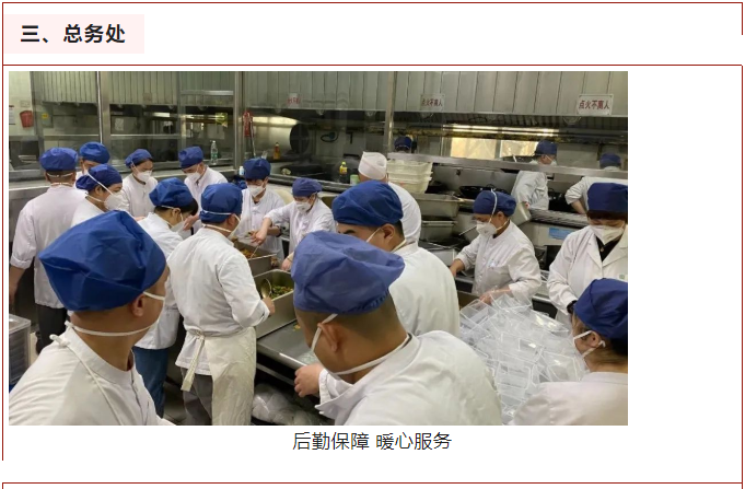 总务处提供全方位的后勤保障。食堂除做好在院患者、全院职工的服务外,还要照顾好在院学习的学生们。平日里窗口为他们提供多种选择且物美价廉的餐食,还克服困难开辟就餐区,解决了学生们无处就餐的实际问题。