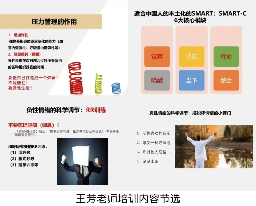 王芳老师作为哈佛大学医学院、麻省总医院第一位获得SMART(思玛特)压力管理项目培训师资格的华人,对压力管理、负性情绪及睡眠质量改善、预防疾病等亚健康状态的调整等方面深入研究,著有国内第一本系统介绍SMART压力管理的专著《当压力来敲门——哈佛大学 SMART 压力管理本土化指导手册》。