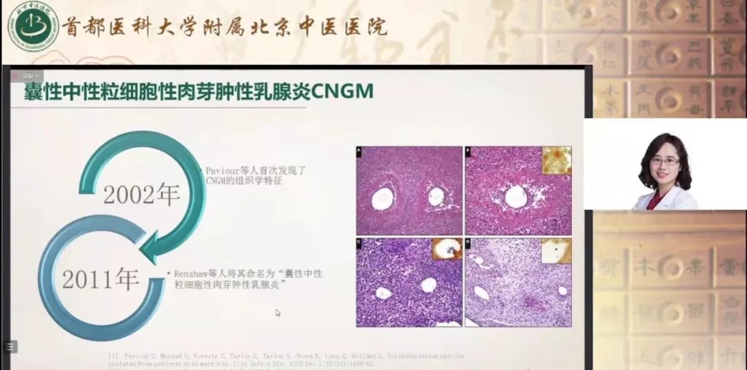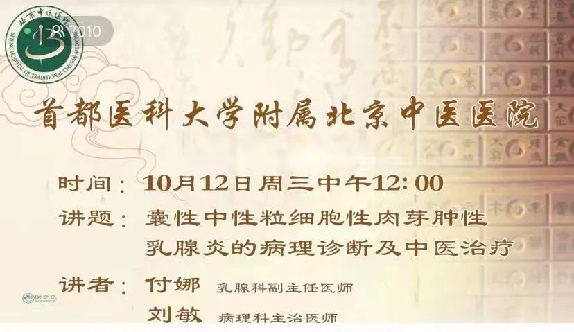 近日,为加深全国乳腺专业医师及相关病理专业人员对于囊性中性粒细胞性肉芽肿性乳腺炎的了解,我院乳腺科和病理科联合举办“双管齐下、乳此精彩”中西医结合诊治乳管内病变网络大讲堂第94期讲座——囊性中性粒细胞性肉芽肿性乳腺炎的病理诊断及中医治疗。