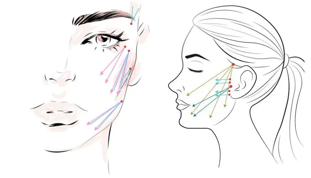 本例微创“埋线”美容技术是通过微小创面,利用可吸收线材特有的牵拉物理特性,达到提升面部结构轮廓、紧致提升的目的,是在延衰领域的升级发展。“线”技术的应用可规避其它微创整形材料的风险,微创恢复快,维持时间相对较长,组织相容性好,排异反应少过敏率低,在促进胶原蛋白和弹力纤维再生以及改善血管通透性方面具备一定的优势。