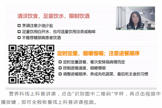饮食治疗是糖尿病治疗的“五驾马车”之一,是控制血糖和防治并发症的重要措施,应贯穿糖尿病治疗全过程,建议糖尿病患者在专业指导下,制定适宜的营养计划,合理控制总能量摄入,均衡膳食,慧吃慧选,来实现平稳控糖。如您需制定个体化饮食方案,请至营养门诊进行诊疗,科室制作相关疾病科普宣传彩页,免费向患者提供。