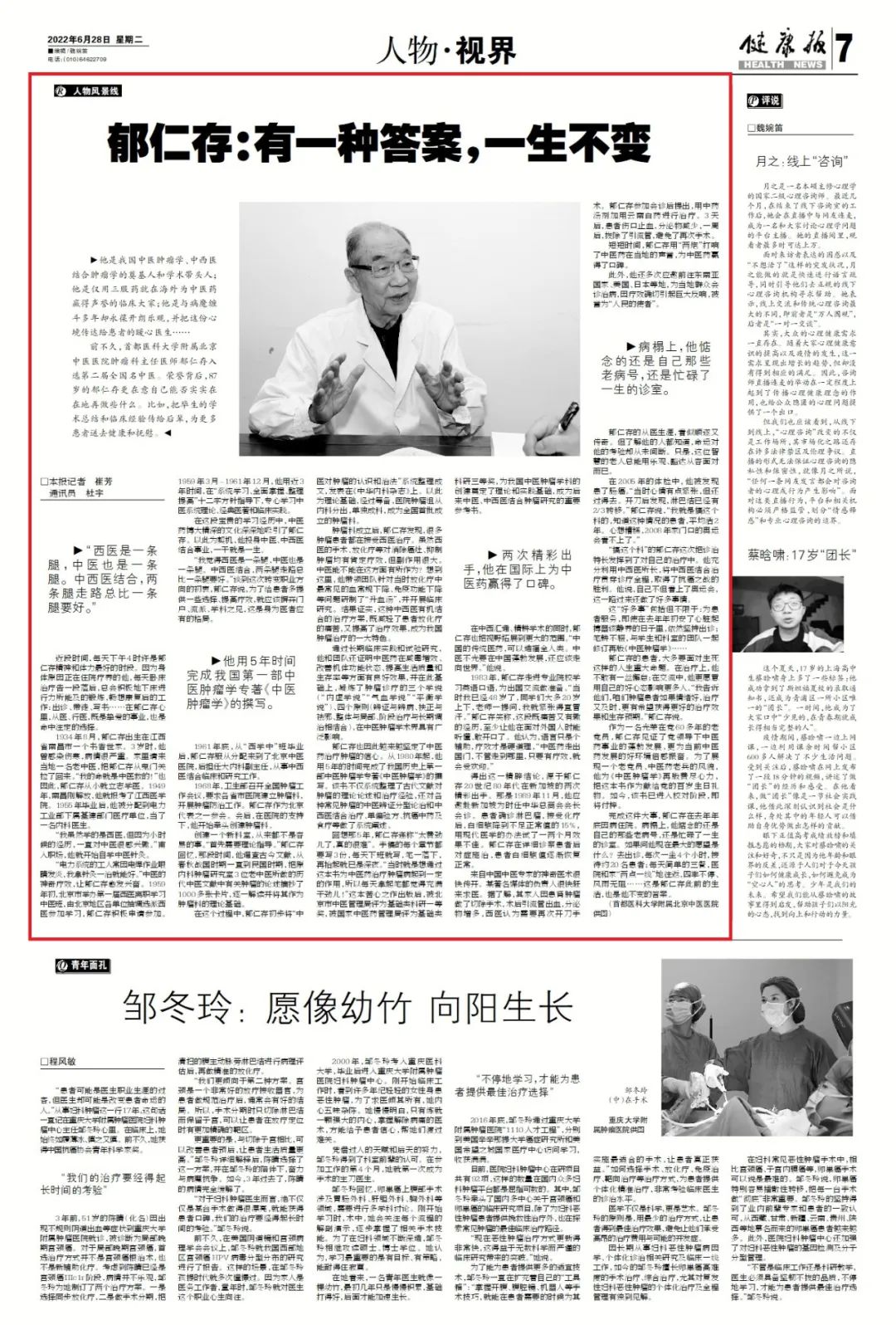 《健康报》曾于2022年6月刊发郁仁存教授专访文章,今日重发此文,缅怀郁老。