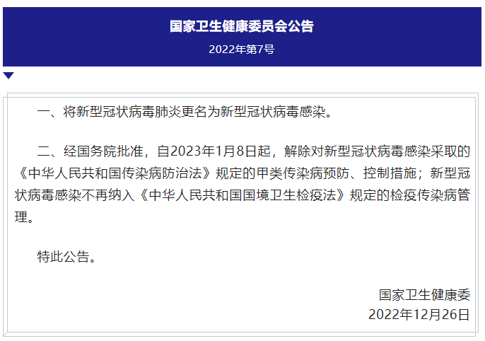 国家卫生健康委:新冠肺炎更名为新冠感染