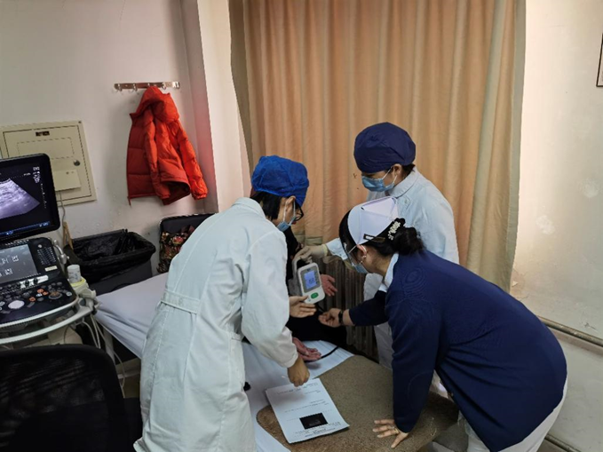 接到通知后,急诊科医师第一时间赶到超声科诊室,为梅奶奶进行测量血压、血糖等相应处置,并询问病史、症状,进一步评估病情,同时紧急将患者转运到急诊完善相应诊治。