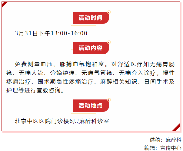 在麻醉周期间,北京中医医院麻醉科开展宣教咨询活动,医护人员为患者提供科普知识宣教和医疗护理咨询,让更多人了解手术麻醉、了解无痛与舒适医疗、疼痛治疗等。